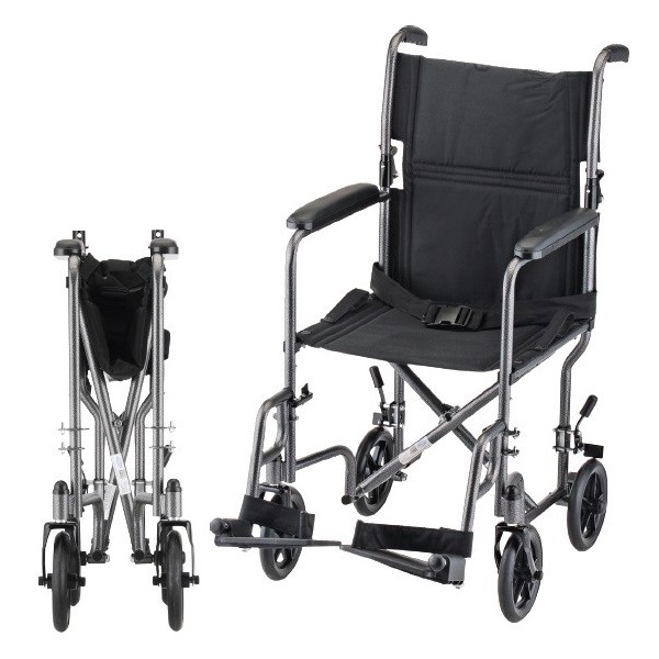 FEATURESCarbon steel frameFixed full-length armsQuick release fold-down backLocking rear wheelsNon-skid foot plates & heel loopsFoldable8” Wheels